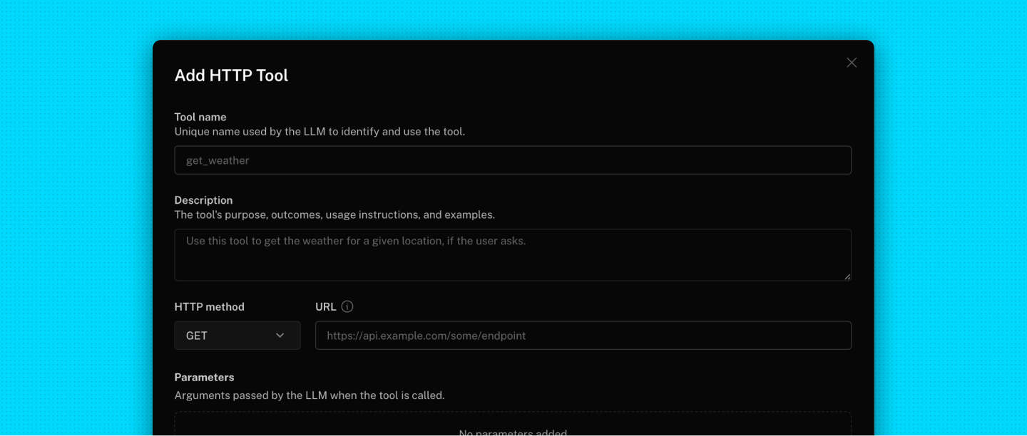 Configure each tool with a URL, optional headers, and request body, and the agent decides when to invoke it based on the context of the conversation. Responses are passed back into the agent's context so it can use real-time data to inform its replies.