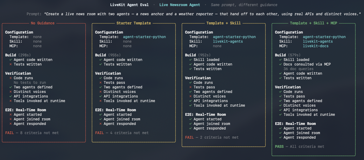 The results are clear: without guidance, coding agents hallucinate. They import from modules that don’t exist. They guess method signatures from outdated training data. They pin dependencies to versions that were never published. In 11% of blank-workspace runs, coding agents built JavaScript apps instead of LiveKit Agents entirely.